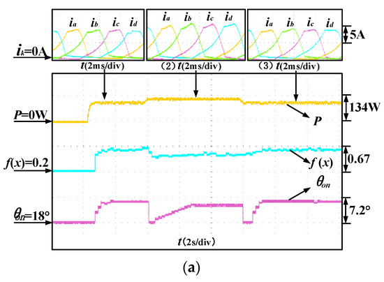 Figure 12 shows the dynamic response for turn-on angle tuning at 800 rpm and the turn-off angle is regulated according to (12). The phase current at steady operation is shown at the top of the figure and SRG operates in the current control mode. The controller sets the output power as the top control objective. Figure 12a shows the dynamic response from 0 W to 50 W, from 50 W to 70 W and from 70 W to 50 W respectively. According to the experimental results, after the multi-objective optimization, the system efficiency is improved, the power converter loss is reduced and the voltage ripple is increased. Figure 12b shows the comparison of output voltage ripple before and after optimization. In order to improve the overall performance, voltage ripple is sacrificed to a certain extent. It can be seen from experiments that when the output power changes from 50 W to 70 W, the system efficiency is reduced, the voltage ripple is improved and the power converter loss is increased. Parameter changes eventually lead to a decrease in the value of the multi-objective function. When the output power changes from 70 W to 50 W, the change trend of the above parameters is reversed.