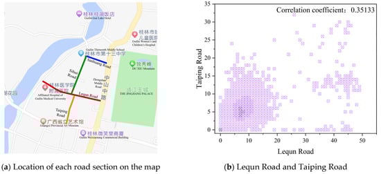 Taking the four on-street parking sections in Xiufeng District of Guilin—Sanhuang Road, Sihui Road, Lequn Road, and Taiping Road—as examples, the relative positions among several road sections can be observed through Figure 6a. In terms of physical location, the physical distance gradually increases between Taiping Road and Lequn Road, Sihui Road and Sanhuang Road, while by observing the two-dimensional scatter plot between the road sections, it can be seen that as the physical distance between the two road sections increases, the correlation between their parking demand decreases. It can also be observed that the correlation between two road sections that are very close in physical distance does not produce a very large gap with those that exist at a certain distance. It can be seen that the correlation between Lequn Road and Sanhuang Road, which are not physically located next to each other, even exceeds the correlation between Lequn Road and Taiping Road by quite a bit. Therefore, it can be inferred that there may be other types of features that also have an impact on the correlation between the road sections.