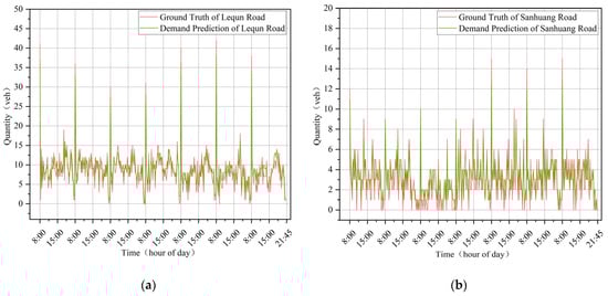 Figure 12 shows the comparison of the results of various types of neural network baselines with the models proposed in this paper for each day of prediction. Due to the large amount of data and the density of the data, we have performed only one day of prediction results of Lequn Road for comparison in Figure 12. It can be seen that although these baseline models can capture the fluctuation of demand to some extent, they are not sensitive to some sudden fluctuations or abrupt changes caused by special time, and they can often only fit the general tendency, but cannot obtain more accurate prediction results.