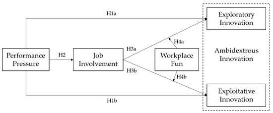 Firstly, workplace fun can promote employee identification and involvement. In an environment where the organization provides support, it is more conducive to innovation []. Fun, as an activity that occurs in the workplace and can make employees feel happy, reflects the support of the organization toward employees [,]. Existing studies have found that employees can gain resources by interacting with others through activities that are enjoyable in the workplace, which can contribute to job engagement []. Under the joyful emotional experience, employees’ thoughts and behaviors will change []. This positive emotion is a supplement to the passive promotion of job involvement under performance pressure, and the innovation level will be significantly improved in a focused work state []. As employees become more engaged, they tend to think of new ways to improve their existing job performance and get involved in exploratory and exploitative innovation.