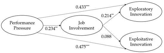 Both exploratory innovation and exploitative innovation represent innovative changes based on existing foundations, with only differences in knowledge learning and novelty. Therefore, overall, performance pressure will have a beneficial impact on ambidextrous innovation. However, the novelty level and risk level of exploratory innovation and exploitative innovation are different, so there are also differences in their intrinsic driving motivations []. Performance pressure helps employees with learning, stimulates exploration and trial and error, and triggers creative thinking. Therefore, we believe that job involvement plays a mediating role in the relationship between performance pressure and employee ambidextrous innovation, and this mediating role will be more evident in the impact path of exploratory innovation with stronger trial-and-error learning requirements. Based on the above considerations, this study proposes the following hypotheses: