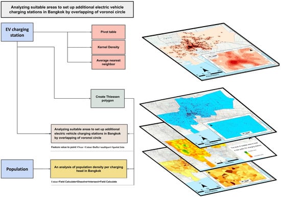 Data sourcing was comprehensive, drawing from a wide array of websites and mobile applications, notably PlugShare, EAAnywhere, MEA-EV, PTT-EV-Station, MG-iSMART, and Tesla, among others. These platforms were instrumental in providing granular details on the features of EV charging stations, including location coordinates, charging capacities, connector types, and the availability of ports. Supplementary geographical data pertaining to the urban infrastructure and demographic patterns were meticulously sourced from authoritative digital portals such as MITEARTH, BangkokGIS, the Department of Provincial Administration (DOPA), and the Bangkok Metropolitan Administration (BMA). The integration of these authoritative sources enriched the dataset with vital insights into urban planning and governance, crucial for the study’s scope. The gathered data underpins the spatial analysis conducted in this study, aiming to map and assess the distribution of EV charging stations in Bangkok. This analysis seeks to identify spatial patterns, distribution inequities, and potential areas for infrastructure development, providing a foundation for recommendations on enhancing the city’s EV charging network. The overall methodology can be found in Figure 1.