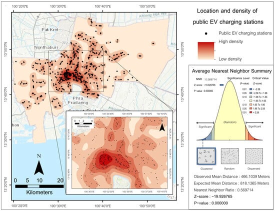 The initial objective involved calculating the NNI to understand the spatial distribution pattern of EV charging stations. Data importation involved electric vehicle charging station coordinates, utilizing the Average Nearest Neighbor tool within a GIS environment. This process necessitated setting the projection to WGS 1984 UTM and defining the analysis area based on the administrative boundaries of Bangkok, calculated as 1,568,950,000 square meters. A “Generate Report” function was enabled to document the findings comprehensively. Equation (1) can be used to calculate NNI directly without using ArcGIS 10.8.1.