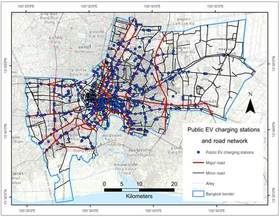 Spatial distribution of charging stations along the road network in Bangkok.