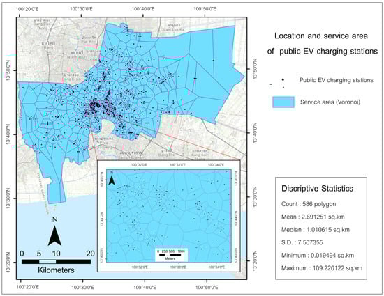 The content of this paper is organized as follows. First, Section 2 details the materials and methods used in this study, beginning with the analysis of spatial distribution patterns of EV charging stations in Bangkok, including the Nearest Neighbor Index (NNI) calculation, Kernel Density Estimation, and the categorization of EV charging station locations. This is followed by the generation of Voronoi diagrams and an assessment of population density and charger accessibility, concluding with the methodology for assessing the suitability of new charging stations using overlapping Voronoi circles. Section 3 presents the results, covering the spatial distribution patterns of EV charging stations, their service boundaries, and the service burden relative to population data, as well as identifying suitable areas for new charging stations. Finally, Section 4 provides a comprehensive discussion, addressing the spatial distribution patterns, service areas, and service loads of EV charging stations, the infrastructure requirements for effective EV charging networks, and suitable areas for additional charging stations.