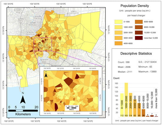 This population data were then imported into the software, where a spatial join was performed. This operation linked the Excel-based population data with the administrative boundary Shapefile of Bangkok, enabling the analysis of population figures in conjunction with geographical boundaries.