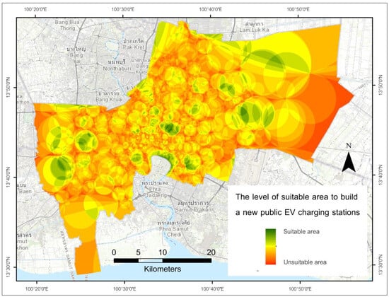Figure 8 displays the analysis of suitable areas for the deployment of additional EV charging stations in Bangkok, highlighting in green the zones of high suitability determined through Voronoi diagram overlaps.