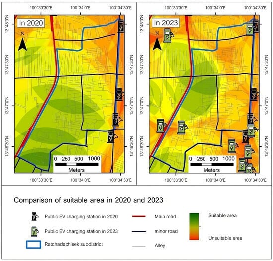 Analysis of EV charging station suitability vs. actual installations (2020, 2023).