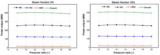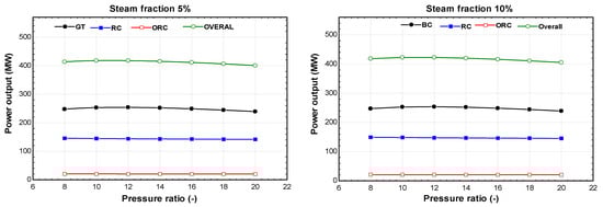 The megawatt power outputs of the BC, RC, ORC, and overall power yield for June with the variations in the BC pressure ratio and steam fractions are presented in Figure 5. The overall power output from the triple combined system is highly dependent on the pressure ratio of the BC. The results indicate that the overall power output increases with an increase in the pressure ratio until it reaches a maximum point and then starts to decline. As the BC pressure ratio increases, the compressed air temperature also increases, leading to an improvement in the combustion process of the natural gas and an increase in the turbine inlet temperature. Eventually, greater GT power is produced. Meanwhile, a large part of the power produced by the GT is consumed by the AC at a higher pressure ratio. Moreover, at a higher pressure ratio, the temperature of the exhaust gases at the exit of the GT decreases, leading to a reduction in the energy available for steam generation in the HRSG; hence, the power is produced by the steam turbine and the ORC turbine.