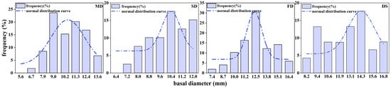 Specific frequency analysis indicated that in mobile dunes, approximately 75% of the basal diameters of S. gordejevii fascicular branches were between 7.9 and 12.4 mm; in semi-fixed dunes, approximately 65% of the basal diameters ranged from 8.0 to 12.8 mm; in fixed dunes, approximately 69.4% of the basal diameters were distributed between 9.0 and 14.0 mm; and in interdune lowlands, approximately 62.2% of the basal diameters were within the range of 9.0–14.0 mm.