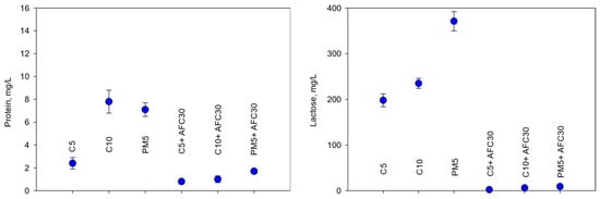 Lactose rejection varied significantly, depending on the type of ultrafiltration module. Ceramic UF modules (with a cut-off value of 5 and 10 kDa) ensured lactose separation of 70%, while the polysulfone PM5 module (with a cut-off value of 5 kDa) separated only 45% of this compound. It should be assumed that the level of lactose separation is primarily responsible for the additional layer of accumulated proteins that forms on the membrane surface. The main reason why the separation of lactose is much greater for ceramic modules is most likely because of the thicker additional layer on the membrane surface (which results from a higher amount of accumulated organic matter (mainly proteins)) and thus a greater share of the sorption in the separation mechanism. An additional contribution to the lactose separation is its sorption in the porous structure of the modules. The large difference between the molecular weight of lactose (342.3 Da) and the module cut-off value excludes the involvement of the simple sieve mechanism in the separation. The relatively high level of lactose separation results from the role of sorption processes during solution purification, with a low concentration of this compound in the purified solution (approx. 0.07% w/v vs. 5% w/v in milk).