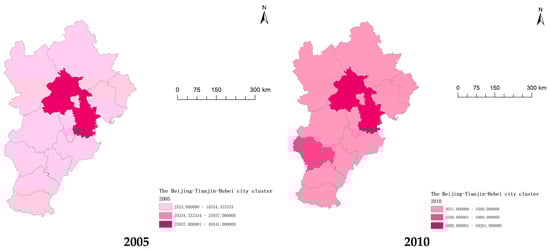 Carbon emissions of the Beijing–Tianjin–Hebei City Cluster in 2005, 2010, 2015, and 2021.