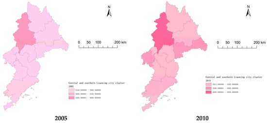 By comparing the total carbon emissions of the five urban agglomerations from 2005 to 2021, it is found that the total carbon emissions of the five urban agglomerations from 2005 to 2021 are large and show an upward trend. As can be seen from the figure, in recent years, the total carbon emission of the Beijing–Tianjin–Hebei urban agglomeration has far exceeded that of the other four northern urban agglomerations, always ranking first and remaining high, or will show an upward trend. The carbon emission trends of the Shandong Peninsula city cluster, Guanzhong plain city cluster, central and southern Liaoning city cluster, and Central Plains city cluster are very similar. The carbon emission of Shandong Peninsula urban agglomeration is always relatively low, and the growth is slow and stable. The Central Plains city group is located between the Beijing–Tianjin–Hebei City group and the Guanzhong City group, with a steady upward trend as a whole. In recent years, the carbon emissions of Shandong Peninsula city cluster, south central Liaoning city cluster and Guanzhong Plain city cluster are close to each other in terms of total amount and growth trend. In summary, the total amount of carbon emissions may continue to increase in the future, and it is urgent to find a positive solution to the problem of carbon emissions.