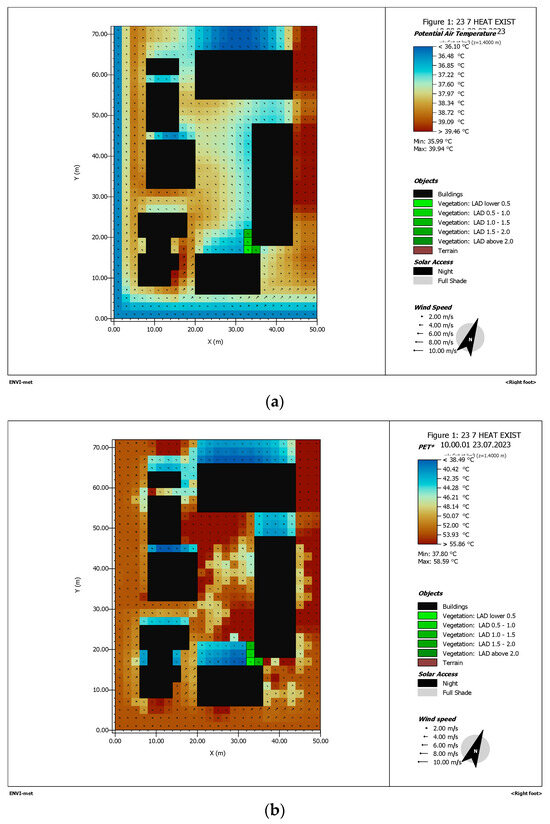 (a) Scenario 1, Simulation using ENVI-met, 23 July 2023, 10:00 a.m., potential air temperature. (b) Scenario 1, Simulation using ENVI-met, 23 July 2023, 10:00 a.m., PET. (c) Scenario 1, Simulation using ENVI-met, 23 July 2023, 10:00 a.m., UTCI.