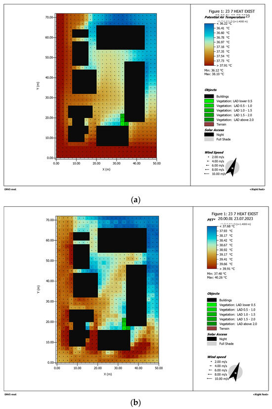 (a) Scenario 2, Simulation using ENVI-met, 23 July 2023, 20:00 p.m., potential air temperature. (b) Scenario 2, Simulation using ENVI-met, 23 July 2023, 20:00 p.m., PET. (c) Scenario 2, Simulation using ENVI-met, 23 July 2023, 20:00 p.m., UTCI.