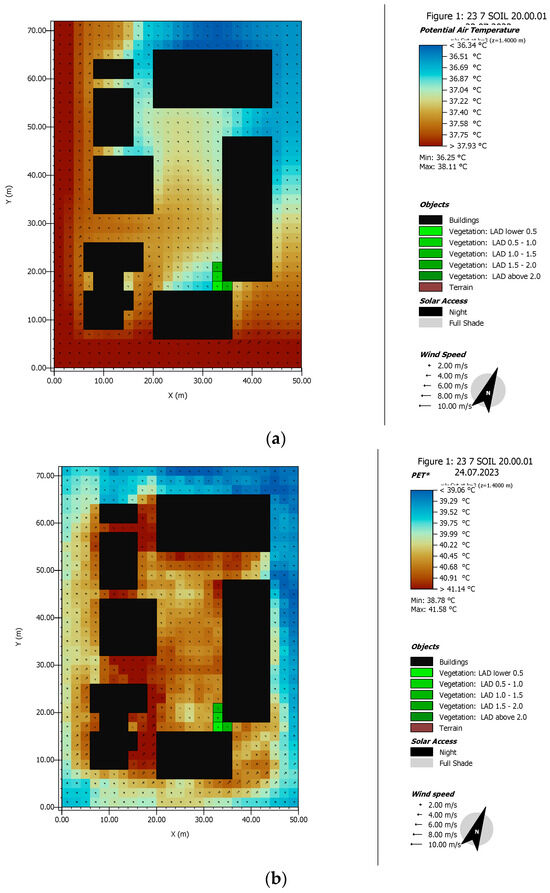 (a) Scenario 2, Simulation using ENVI-met, 23 July 2023, 15:00 p.m., potential air temperature. (b) Scenario 2, Simulation using ENVI-met, 23 July 2023, 15:00 p.m., PET. (c) Scenario 2, Simulation using ENVI-met, 23 July 2023, 15:00 p.m., UTCI.