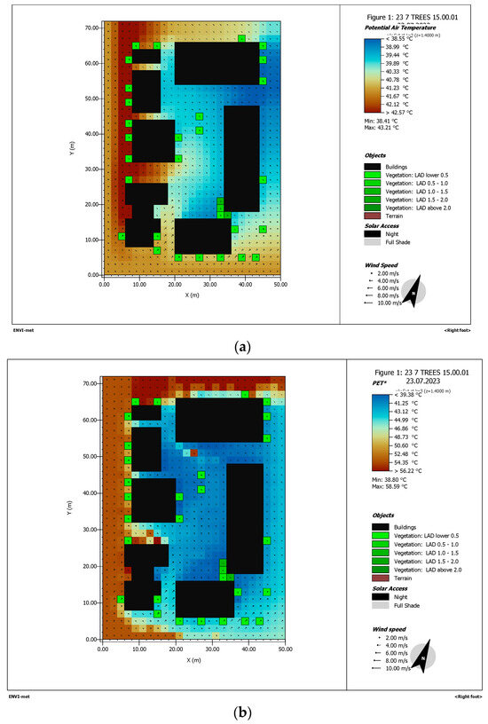 (a) Scenario 5, Simulation using ENVI-met, 23 July 2023, 15:00 p.m., potential air temperature. (b) Scenario 5, Simulation using ENVI-met, 23 July 2023, 15:00 p.m., PET. (c) Scenario 5, Simulation using ENVI-met, 23 July 2023, 15:00 p.m., UTCI.