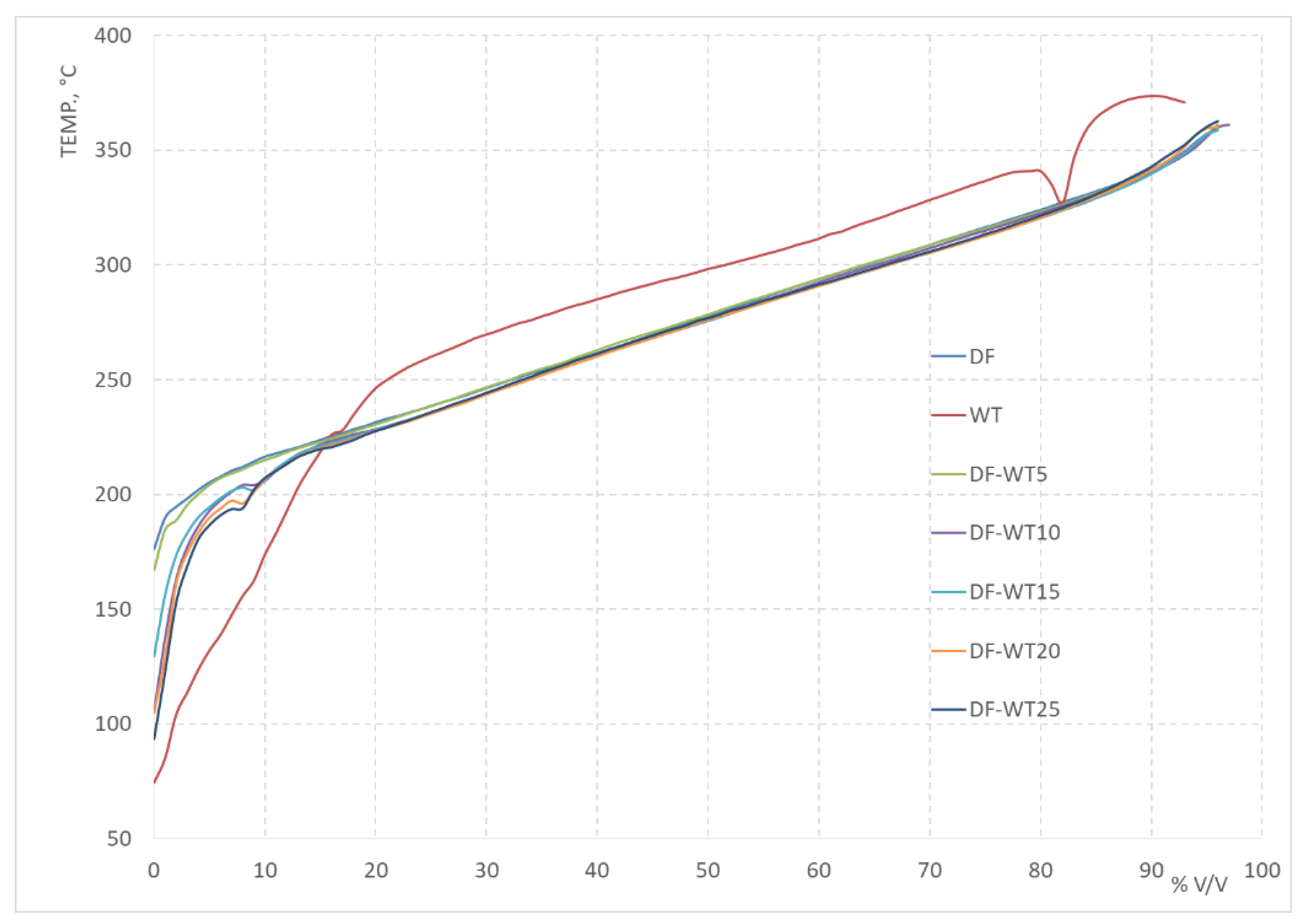Analysis of the distillation curve (Figure 8) shows that the new synthetic fuel has more low-boiling hydrocarbon fractions, as it has already distilled about 10% of the fuel sample volume at 150 °C. After distilling about 20% of the fuel volume, another difference in the fractional composition between WT and DF can be seen. Indeed, one can clearly see the share of heavier fractions in the new fuel, which distils at higher temperatures than in DF. On the other hand, the effect of the addition of synthetic fuel to DF on the distillation curve is noticeable only until about 20% of the volume of the test sample is distilled.
