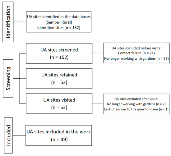 Participants were selected because of their enrolment with the São Paulo City Hall through the website Sampa+Rural [] between 2022 and 2023, where their contact information was available (Figure 2). After applying the selection criteria, field visits were conducted in 49 out of the 152 locations to conduct the semi-structured questionnaire. Reasons for excluding locations from the study included failure to establish contact with the site, cessation of horticultural activities at the time of contact, and respondents not having sufficient time to complete the survey on the day of the visit.