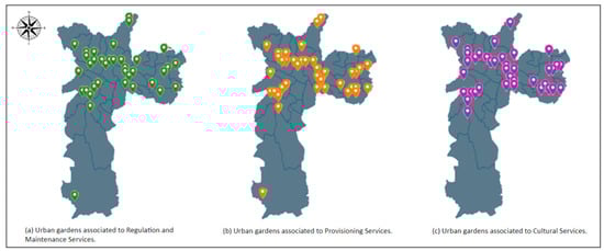 Our findings demonstrate that the geographic distribution of the three main types of ES exhibits uniformity across the entire study area, with only provisioning, regulation, and maintenance services extending to the southern region. In an alternative perspective, Caldas and Jayo’s [] analysis allows for identifying distinct patterns in the location of UA initiatives in São Paulo, characterised by their scale or visibility. In this sense, we could associate the two classifications of UA places in the study with two types of ES: provisioning and cultural, respectively. UA initiatives classified as “scale,” predominantly centred around food supply and consumption, are notably found in the suburbs of the city. In contrast, those with the “visibility” profile, focused on discourse production and visibility for the UA political agenda and strongly emphasising educational activities, tend to concentrate in central regions. The authors acknowledge that, while the mapped initiatives do not constitute a comprehensive census, the results suggest that this distinction between scale and visibility initiatives may be generalised for the entirety of UA in São Paulo. Although the study did not evaluate peri-urban agriculture, this geographical differentiation could, therefore, reflect the distinct emphases of the initiatives, contributing to an understanding of the ES provision and the support that these spaces necessitate from pertinent authorities.
