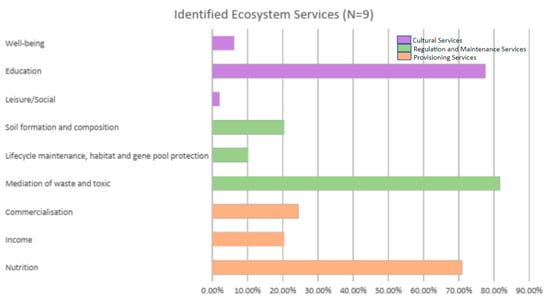 Upon analysing the responses, we identified nine distinct types of ES across the three categories adopted in this study (Figure 6). Within the provisioning category, the nutrition service was identified in 70.9% of cases. Additionally, income generation and commercialisation were considered subclasses of services in this category, with respective identification in 20.4% and 24.48% of sites. The most frequently identified category was regulation and maintenance, encompassing the mediation of waste and toxicity as well as soil formation and composition, identified in 81.63% and 20.4% of cases, respectively. Moreover, lifecycle maintenance, habitat, and gene pool protection were identified in 10.2% of responses. Lastly, the cultural section showed that 77.55% of cases related to education, 6.12% to well-being, and only 2.04% to leisure/social services.
