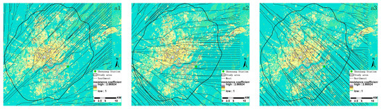 The potential ventilation paths for southwest, west, and northwest dominant winds are depicted in Figure 4a1–a3. In suburban areas, where the frictional effects of the underlying surface are minimal, the paths appear relatively straight. However, there are noticeable turns in urban areas.