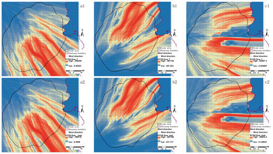 The prevailing wind directions from the southwest, west, and northwest were determined by interpolating the wind direction points distributed along the potential ventilation pathways (Figure 4b1–b3). The direction of the wind flows follows the trajectory of the respective potential ventilation paths, effectively addressing the westerly wind requirements in the study area and illustrating the impact of urban building distribution on wind patterns. Controlling the orientation of the air inlet allows the simulation of wind flow fields in various scenarios. This paper focuses solely on these three directions as examples.