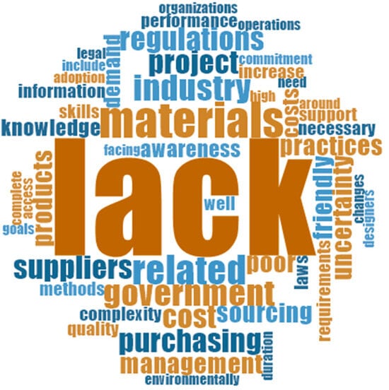 The prominence of the term “lack” reflects the widespread deficiencies across various aspects that constitute major barriers. According to the coded data, these deficiencies include a lack of resources, knowledge, experience, and support from top management and government bodies. For instance, the lack of knowledge and experience in green practices hinders effective implementation, as many organizations struggle to adopt and integrate sustainable methods into their supply chains.