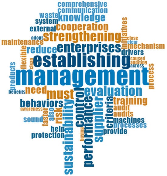 The word cloud analysis for the “Solutions” theme reveals that the most frequently occurring terms are management, establishing, control, and evaluation. These key terms encapsulate the strategies and practices that organizations are adopting to overcome challenges in implementing green supply chain management.