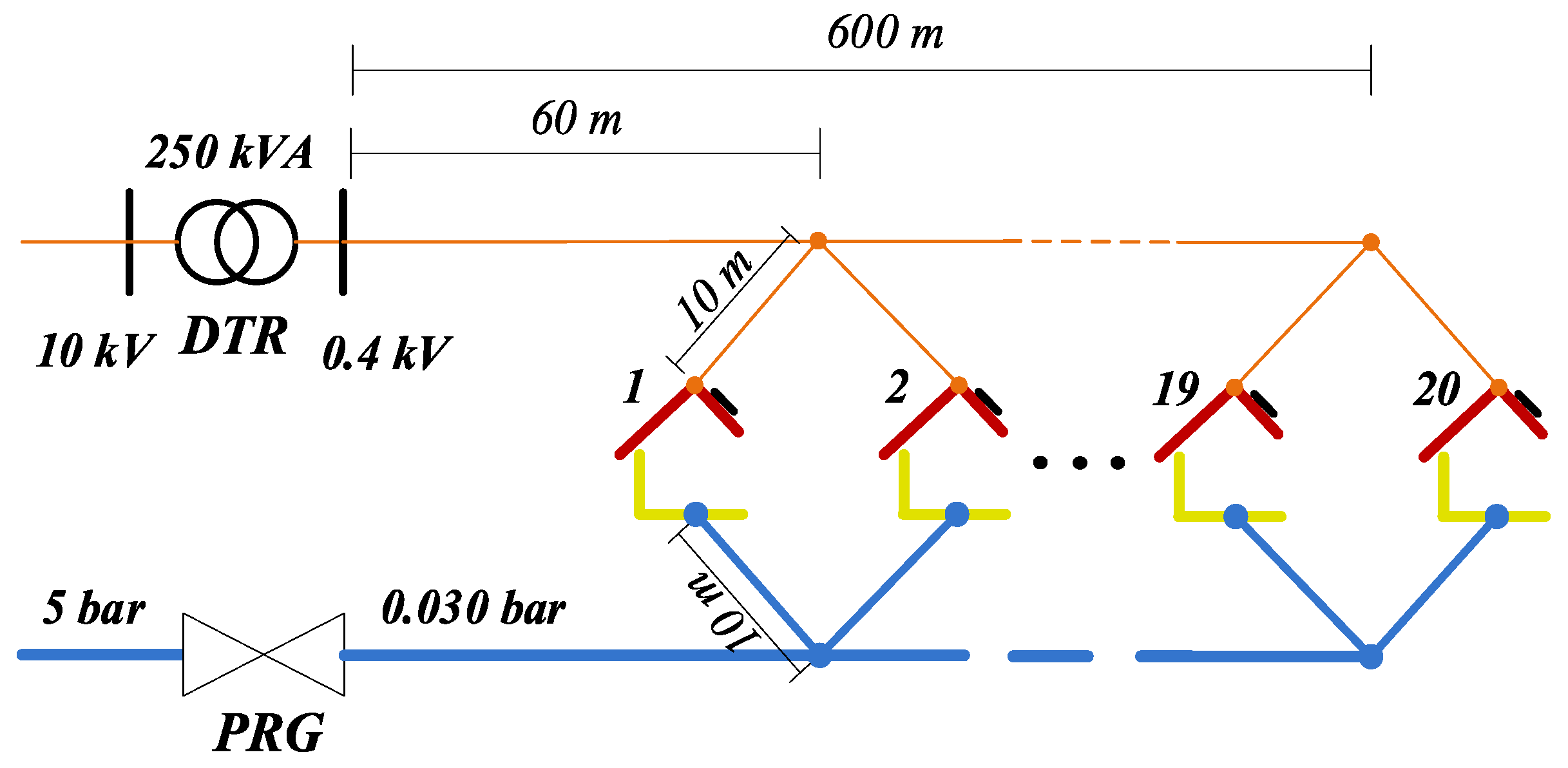 - Cavana, M.; Mazza, A.; Chicco, G.; Leone, P. Electrical and gas networks coupling through hydrogen blending under increasing distributed photovoltaic generation. Appl. Energy 2021, 290, 116764. [Google Scholar] [CrossRef]