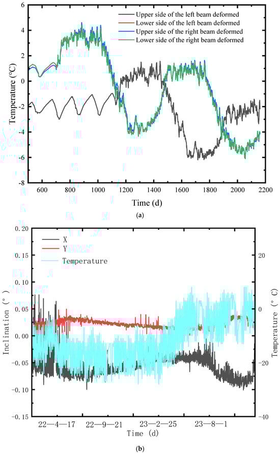 As shown in Figure 2, the monitoring results showed that the beam-joint space had a decreasing trend, and the beam joint on both sides decreased by about 1 cm between January 2019 and November 2020. With the continuous decrease of temperature, the relative deformation of the joint between the grid beam end and the abutment beam first increased and remained stable for a period of time, and the maximum relative deformation was 4.2 mm on the upper part of the right beam seam. With the increase of temperature, the relative deformation of the beam connection gradually decreases, and the minimum relative deformation is located at the lower part of the right beam joint, which is 7.9 mm. After two winter and summer cycles, the reduced relative deformation in summer is greater than the increased relative deformation in winter, and the joint spacing in 2023 is further reduced compared to that in 2022. The reason for the above phenomenon is that the cooling rate of the concrete beam body is obviously faster than that of the subgrade behind the platform, and the concrete beam body shrinks in advance, resulting in the relative deformation of the beam end-abutment connection. As the temperature continues to remain below zero and the ground temperature of the subgrade behind the platform gradually drops to below zero, there is a certain possibility of frost heave deformation, which may have a horizontal extrusion effect on the abutment. In the relative deformation of the beam joint of this abutment, it can be seen that the abutment has a certain horizontal displacement. After the temperature rise in late May 2022, the deformation of the beam itself gradually begins to recover. The relative deformation becomes smaller gradually, which is because the horizontal displacement caused by frost heave extrusion behind the abutment cannot be recompensated at low temperatures. According to the temperature−time history curve of the K1013 + 358 bridge, the temperature in November 2021 has entered temperatures below zero. From March 2022, the daytime temperature gradually rises above zero, and by the beginning of June, the temperature will be virtually above zero. The overall minimum temperature is below −27 °C, and the maximum temperature is above 20 °C.