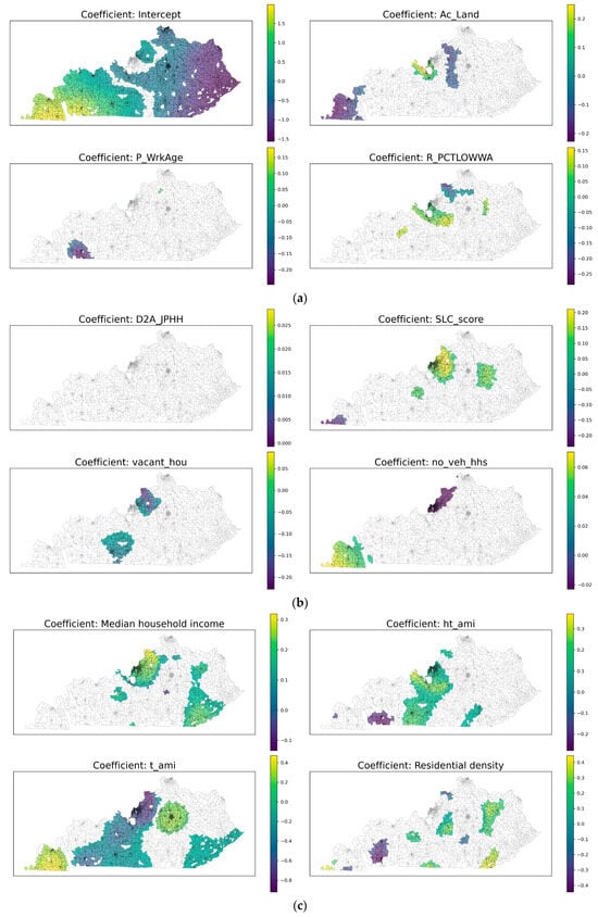 Distribution of coefficients over Kentucky: (a) intercept, Ac_land, P_WrkAge, and R_PCTLOWWA (percent of low wage workers); (b) D2A_JPHH (jobs per household), SLC_score, vacant_hou, and no_veh_hhs (no vehicle households); (c) median_household_income, ht_ami, t_ami, and residential density; (d) intersection density, P_65, P_5, and P_18.