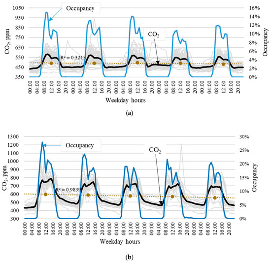 Figure 6 shows the monitoring results of CO2 and occupancy variation, as well as building occupancy histograms for the four buildings analysed. Separate grey lines present weekly variation in CO2 concentrations and black bold lines present the average weekly curves from Monday to Friday, with blue lines representing variation in the occupancy.