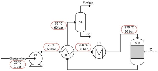 With the aim of evaluating the possible integration of APR in the cheese-making value chain, an energetic assessment was conducted. Figure 1 depicts the simplified process flow diagram with the main equipment units. The effluent from the cheese-making process is first pressurized up to the desired value. The minimum investigated value is equal to 60 bar, i.e., slightly higher than the vapor pressure of water at the reaction temperature (270 °C) to ensure the liquid phase. Pump efficiency of 90% was assumed to estimate the energy duty.
