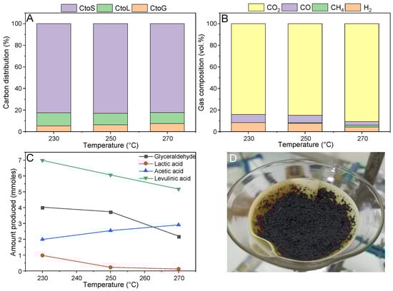 Influence of reaction temperature on (A) carbon distribution; (B) gas composition; (C) main liquid products. Reaction conditions: 10 wt.% lactose, 120 mL solution, 0.375 g Pt/C, 2 h. (D) Residual solid phase recovered during the filtration step.