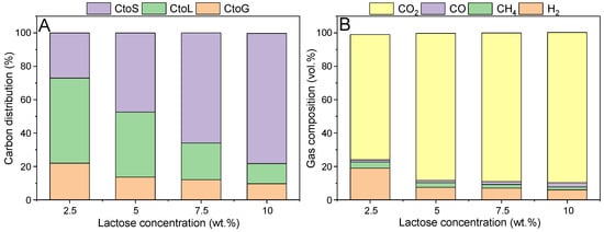 Influence of lactose concentration on (A) carbon distribution and (B) gas composition. Reaction conditions: 270 °C, 120 mL solution, 0.375 g Pt/C, 2 h.