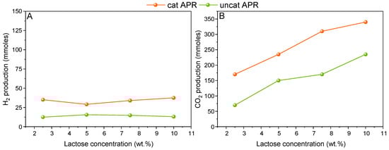 It was shown in the previous section that homogeneous reactions, i.e., not linked to the presence of the catalyst, may affect the APR performance specifically when a concentrated lactose solution was used. For this reason, this variable was investigated by performing uncatalyzed APR reactions at different initial concentrations. Figure 4 reports the hydrogen (A) and carbon dioxide (B) production in the case of catalyzed and uncatalyzed APR, respectively.