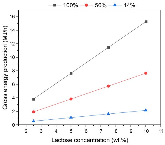 An amount of 1 kg/h of cheese production was assumed as the basis. According to Lappa et al., it can be assumed that approximately 9 kg/h of cheese whey are produced []. The amount of lactose can vary in such effluent: in our assessment, a sensitivity study considering a range between 2.5 and 10 wt.% was performed. The gross energy production was estimated considering three scenarios: 100%, 50%, and 14% hydrogen yield, where the latter was the one obtained in the APR-alone configuration. As observed in Figure 6, the energy production increased with the initial lactose concentration and the hydrogen yield, as can be expected. This energy was obtained from the lower heating value of the produced gas stream.