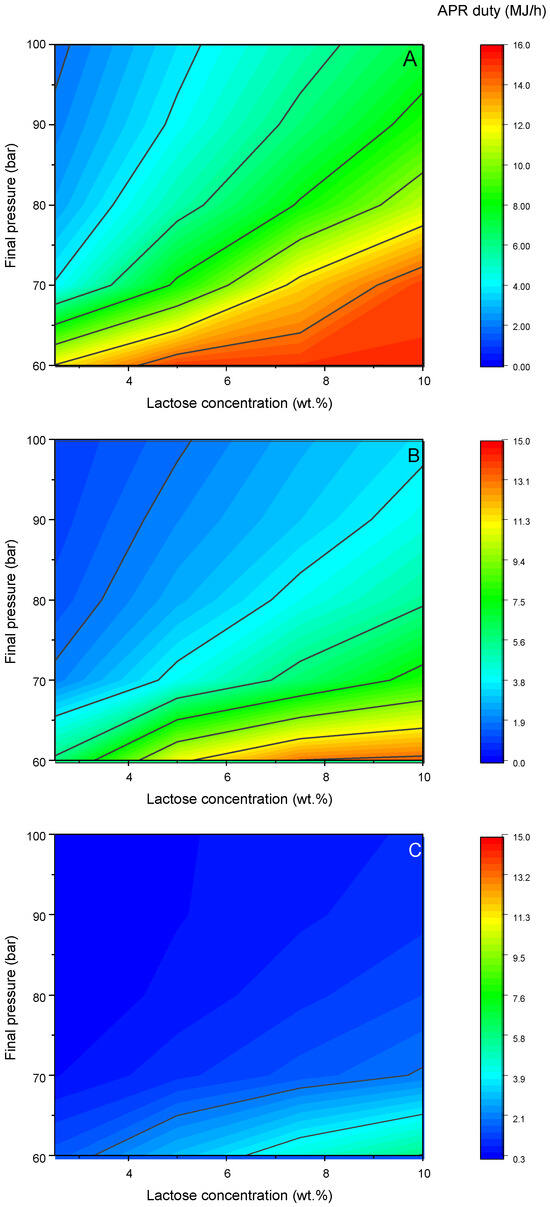 Influence of lactose concentration and system pressure on the APR reactor energy duty. (A) 100% H2 yield; (B) 50% H2 yield; (C) 14% H2 yield.