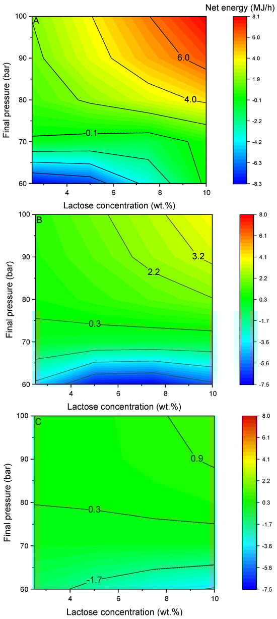 Figure 8 depicts the net energy of the system, calculated as the difference between the gross energy production in the APR step and all the energy duties of the process, i.e., the pressurization, the trim heater requirement, and the reactor duties. As can be observed from the complex geometry of the contour plots, the net result was due to a tradeoff between the higher production at the higher lactose concentration, but also the higher expense because of the water vaporization associated with it. For this reason, by increasing the conversion level, the span of the net energy increased strongly (from ca. 1 MJ/h at 14% H2 yield to ca. 16 MJ/h at 100% H2 yield).