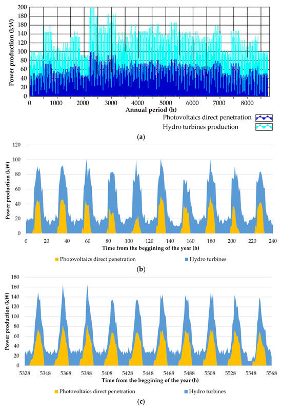 In Figure 14a,b, the annual power production synthesis graphs are presented for the specific HPP and for the sizing scenario with the minimum LCOE and with 100% RES penetration.