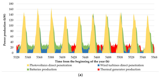 Additionally, for the aforementioned two sizing scenarios, in Figure 15a,b, the power production synthesis graphs are presented from the 1st to the 10th of January. Similar graphs are, finally, presented in Figure 16a,b for the aforementioned two sizing scenarios and from the 11th to the 20th of August.