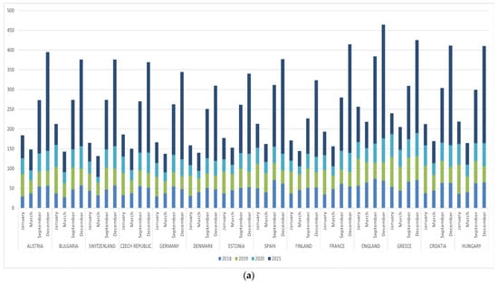 A comprehensive approach also requires a monthly in-depth analysis. Specifically, Figure 5a,b show monthly price changes in January, March, September, and December in the selected period (2018–2021) per country. It can be seen that the intensity of price changes was highest in December, given that the seasonal character is evident, i.e., that in the winter months there is an increased demand for electricity by industry and households. The level of electricity consumption changes during the day, with higher consumption during the daytime hours and lower consumption during the night. Consequently, it affects electricity prices that differ and change on an hourly basis. The same principle is present in the seasonal pattern, that is, the consumption of electrical energy is higher during strong winters. We emphasize the months in which high monthly volatility is presented (January, March, September, and December). Also, according to the results of the analysis, it is concluded that there is no high volatility present in each month, and it would be wrong to conclude that the monthly price volatility is high in all months during the year.