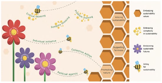 Six years later, GreenComp was introduced in 2022 as a comprehensive and common understanding of sustainability competencies. The framework consists of 12 different competencies organized in four main areas: embodying sustainability values, embracing complexity in sustainability envisioning sustainable futures and acting for sustainability. Under the term “sustainability” the authors of GreenComp specify “prioritising the needs of all life forms and of the planet by ensuring that human activity does not exceed planetary boundaries” [] (A8 in Appendix A). Based on this, the GreenComp framework defines sustainability as a competence that enables learners “to embody sustainability values, and embrace complex systems, in order to take or request action that restores and maintains ecosystem health and enhances justice, generating visions for sustainable futures” []. Figure 2 shows an overview of green competencies corresponding to Figure 1 in the four main areas mentioned above that are represented by four symbols in a metaphorical graphic: bees (acting for sustainability) are carrying pollen (embracing complexity in sustainability) from flowers (envisioning sustainable futures) to their pod (embodying sustainability values), underlining their interdependence.