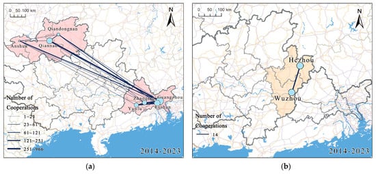 To analyze the spatial pattern of the intercity cooperation network, this study applied Jenks natural breaks classification to categorize the number of cooperations between cities from 2014 to 2023 into five levels (Figure 2). To better illustrate the dynamic evolution of this spatial structure, it focused on the top three levels with high-intensity linkages, excluding the lower two levels (Figure 3) [].