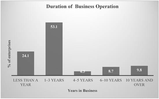 While our study focuses on operational longevity as a resilience proxy, we acknowledge its limitations in forced displacement contexts, where social capital (e.g., trust, networks) often plays a critical role []. Though not analysed here, our dataset captures preliminary social capital indicators (e.g., community connections), offering a foundation for future research. We clarify this as a boundary condition but argue that our findings remain valuable for understanding institutional persistence in non-conflict settings, while highlighting the need for complementary metrics in crisis scenarios. In addition, our analysis included age, education, marital status, number of children, and business sector as controls, based on their established relevance in livelihood resilience literature []. While age and the domestic services sector showed significant effects (p < 0.01), other controls were non-significant and excluded from final models to maintain parsimony [].