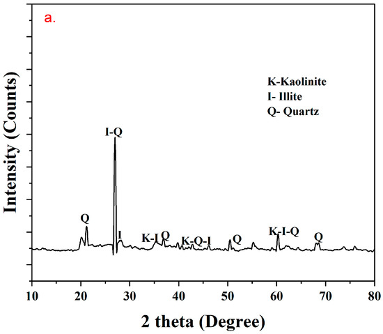 Following the study on the characterization of DSD, it is essential to analyze the properties of clayey soil to understand the behavior and interaction with additives (DSD and ICL). The chemical composition of clay is analyzed through XRF and reported in Table 2. The result reveals that the main constituents, SiO2 and Al2O3, highly influence the reactivity of clay when it is mixed with a suitable activator such as lime and pozzolanic material like DSD. The presence of such components is confirmed through the XRD profile of the clay [79].