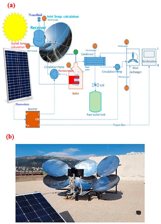 Today, energy is an increasingly important concept that affects everyone. In particular, the problems of global warming and environmental pollution caused by the fact that fossil fuels essentially meet the energy demand and the prediction that fossil fuels will run out in the not-too-distant future have led to the proliferation of renewable energy studies [,]. Renewable energy is derived from the energy flow available in continuous natural processes. Solar energy is considered to have the highest potential among existing renewable energy sources []. Parabolic dish concentrators (PDCs) are one of the most common ways to focus solar radiation []. The PDC directs the solar radiation and helps it accumulate in an absorber. With the accumulated high temperature, the thermal fluid in the receiver can be used in many heat processes. One of them is the distilled water production process. Researchers have extensively studied distilled water production with a PDC system.