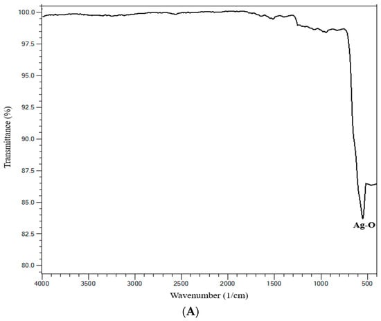 Fourier transform infrared spectroscopy (FTIR) spectrums of silver nanoparticles (AgNPs) show a high transmittance percentage across most of the wavenumber range, indicating minimal absorption in the infrared region (Figure 4A). A significant absorption band is observed at the lower wavenumber region, around 500 cm−1, which is attributed to the Ag-O stretching vibration. This suggests the presence of silver oxide on the nanoparticle surface, likely due to partial oxidation of silver. The absence of strong peaks in the higher wavenumber region indicates that there are no significant organic functional groups attached to the nanoparticles.