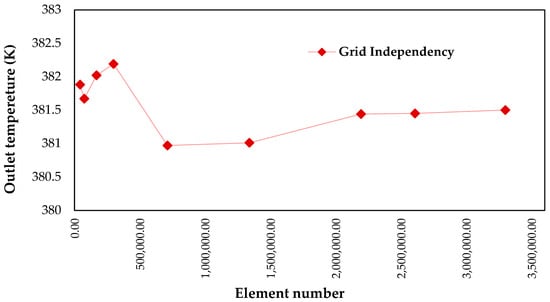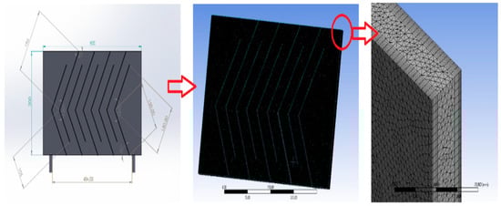 Figure 2 shows the schematic preparation of the hybrid nanofluid. The viscosity of the hybrid nanofluids targeted for use in this study was calculated using the following equation []. Esfe et al. experimentally investigated the thermal conductivity and dynamic viscosity of Ag-MgO/water hybrid nanofluid []. They compared their experimental results with five dynamic viscosity equations frequently used in the literature. The best result was obtained by Chen et al. []. In this study, the viscosity, thermal conductivity coefficient, and specific heat parameters to be used in the thermal analysis of the working fluid by the CFD method were calculated by Equations (20)–(23).